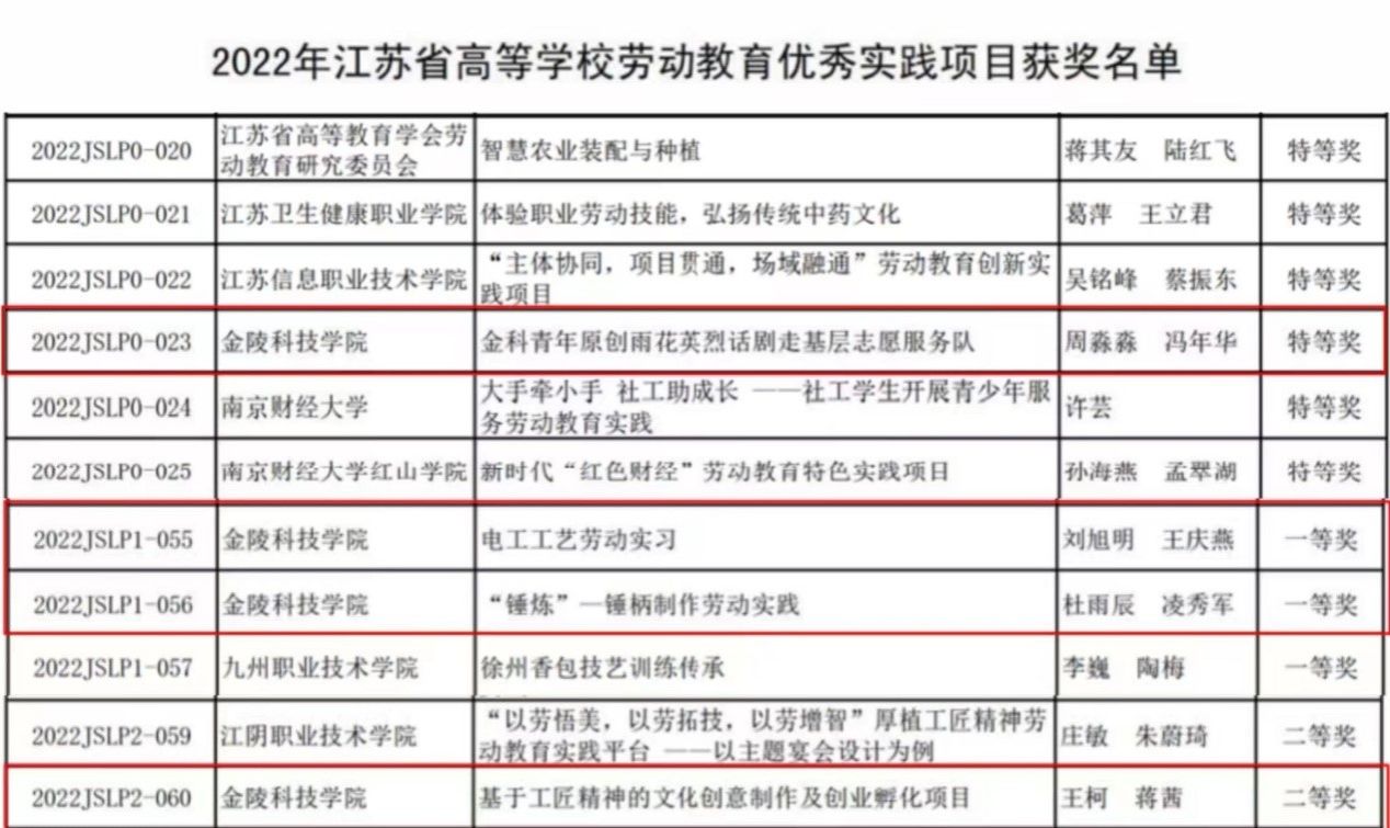 根据《关于公布2022年江苏省高等学校劳动教育优秀实践项目评选结果的通知》(苏高教会﹝2023﹞5号)文件,我校择优报送的4个项目全部获奖,其中电影天堂 的《电工工艺劳动实习》《“锤炼”——锤柄制作劳动实践》两个项目获得一等奖。