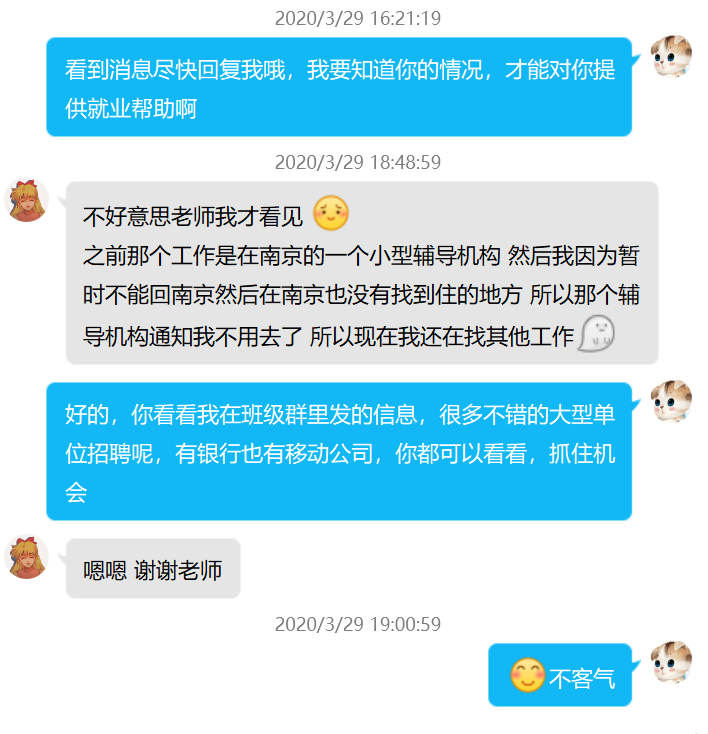 学工办主任、毕业班辅导员、班主任更是面向家庭困难、学业困难以及湖北疫区学生重点实施“一对一”就业帮扶,陪伴毕业生“疫”起走过从梦想到现实的最后一公里。