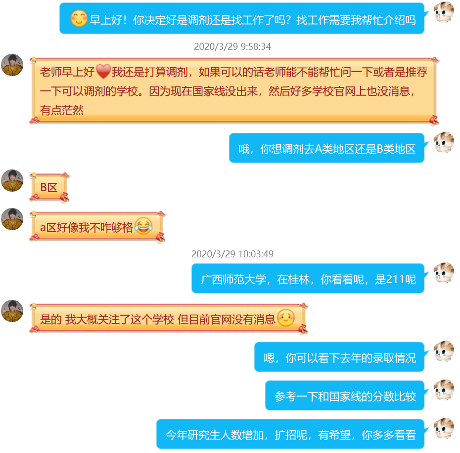 疫情之下,很多毕业生担心自己无法正常到岗实习,耽误工作,王奕通过QQ群、微信、短信及时传达党和政府对毕业生的关心,向学生普及各项优惠政策:告知考研的学生今年将扩大硕士招生规模,鼓励初试成绩不理想的学生积极申请调剂;告知求职的学生今年将扩大重点领域的招聘,鼓励学生多投简历多尝试。