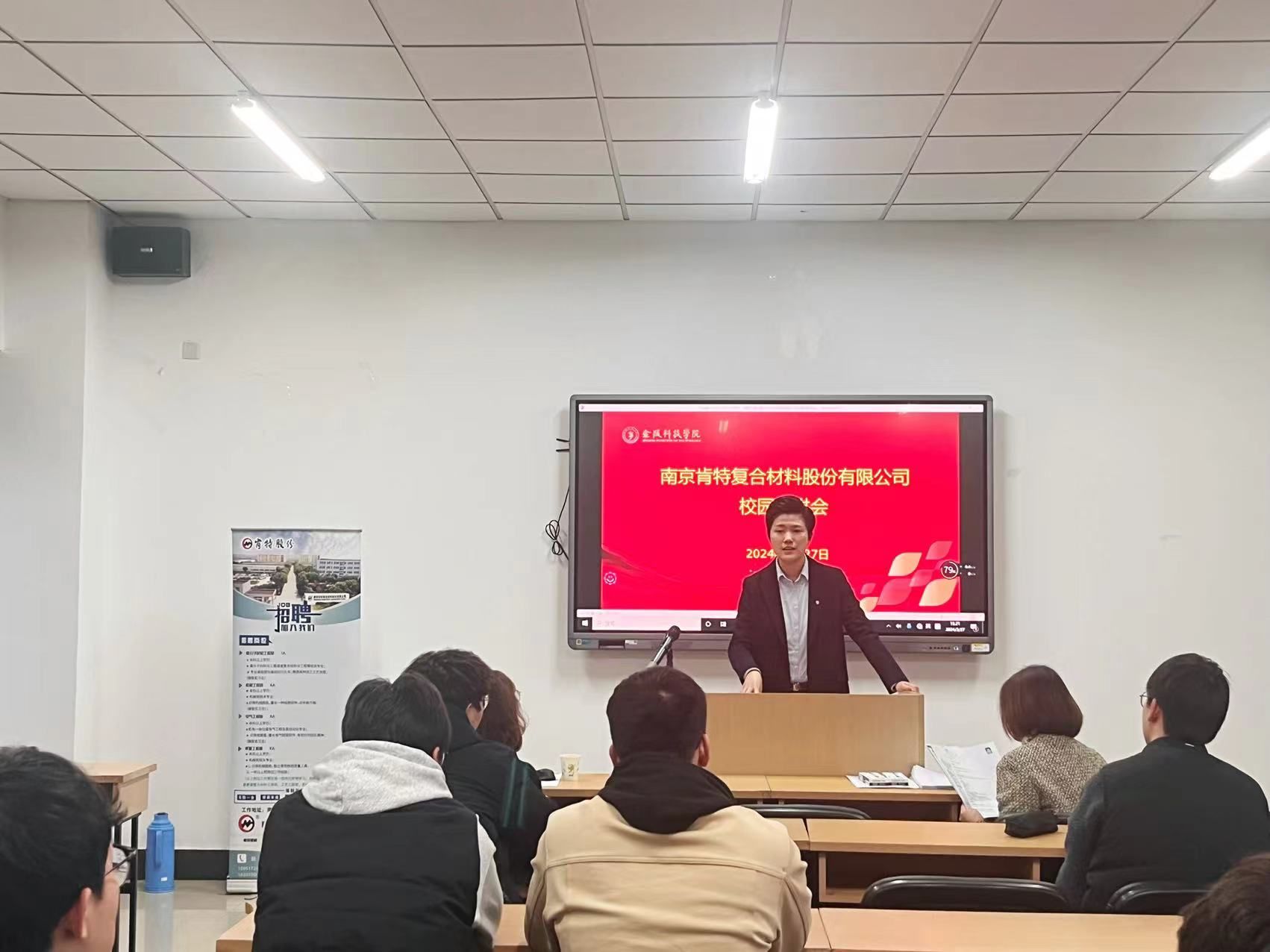 在工科楼C504举办南京肯特复合材料股份有限公司校园专场招聘暨“访企拓岗促就业”交流活动。南京肯特复合材料股份有限公司人力资源部经理许竞文携人力资源部专员韩露、陈亚一行三人、学院党委副书记张蓉、毕业班辅导员、机械系教师、40余名2024届毕业生参加了招聘活动。