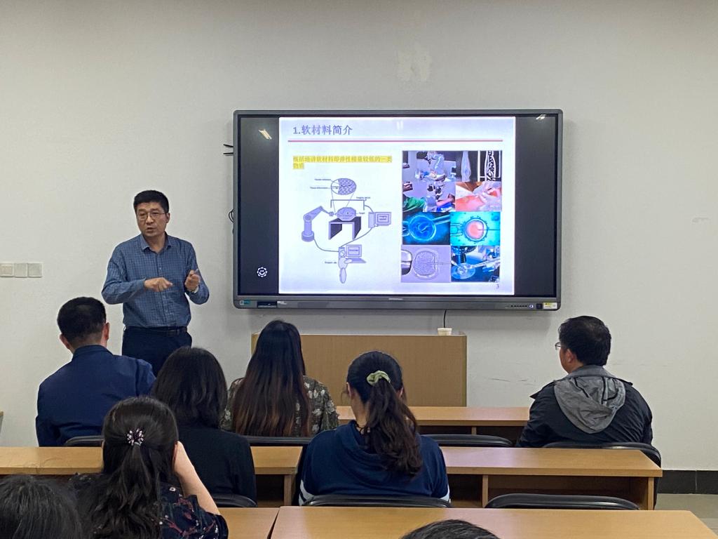 裴鹏宇博士首先介绍软物质是自然界以及生物体中常见的物质,深入认识软物质的变形和破坏规律对软物质的工程应用及生物、医学相关问题的研究具有重要意义。其次他从软物质简述、软物质刺破问题探讨、纤维表面摩擦系数预测改进模型、柔性电子变形控制的逆向问题、智能材料断裂、软物质变形控制等六个方面系统阐述了软材料力学问题,并借助Muskhelishvili理论、Riemann-Schwarz原理分别研究了含一个刚性线夹杂、共线刚性线夹杂的均匀温变问题、稳态热流问题、Green函数问题、粘弹性问题、单纤维拉拔界面摩擦问题,给出了一些典型问题的解析解,依据这些解析解得出了一些有益的结论。讲座结束后,裴鹏宇博士与部分老师围绕讲座内容进行了交流和讨论。