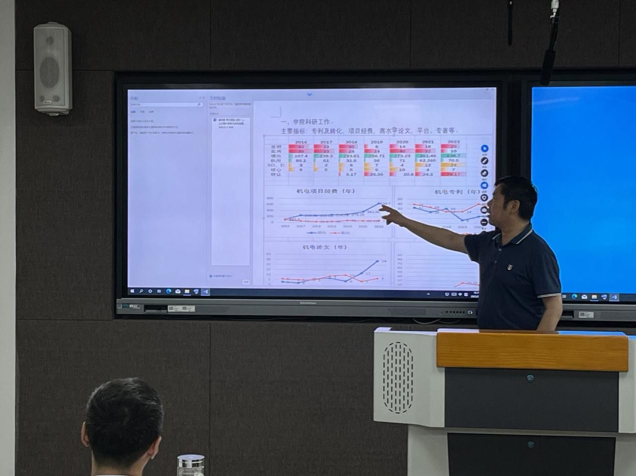 副院长于继明首先对2022年度学院科研工作进行总结。接着对学院科研工作中存在的不足进行剖析,提出科研成果分布需均匀、科研团队建设需加强等改进的方向。最后对学院科研工作的布局和规划进行讲解。希望要以省、市平台为支撑,培育复合型团队,提升承载复杂项目的能力。进一步聚焦领域与行业,深入一线找需求,将项目研究转向产品及服务,走可持续创新发展道路,促进学院科研事业稳步发展。