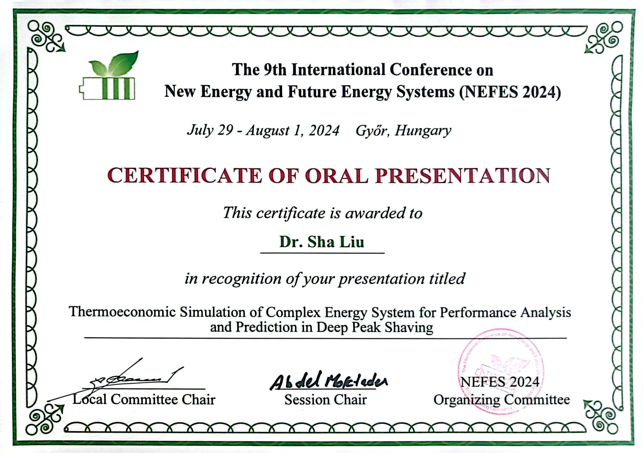 刘莎博士赴匈牙利Szechenyi Istvan大学参加第九届新能源与未来能源系统学术会议。参会人员云集了来自世界各地的研究人员、科学家、工程师、学者和研究生展示他们在新能源和未来能源系统研究领域的最新研究成果和新思路。大会分为4项主旨演讲,9项主题报告,着重对绿色建筑与能源管理、热能与动力工程、新能源技术与材料等9项主要议题进行了学术研讨,电影天堂
